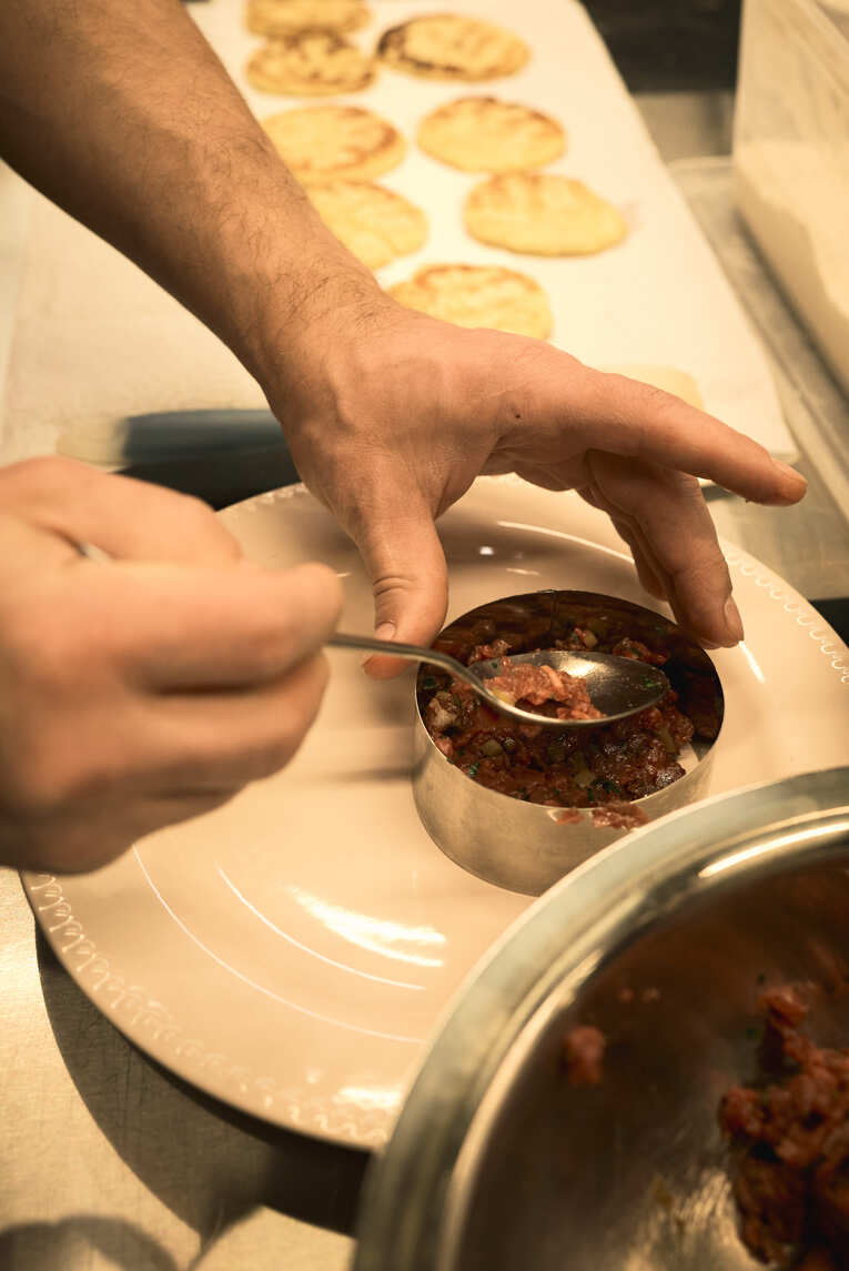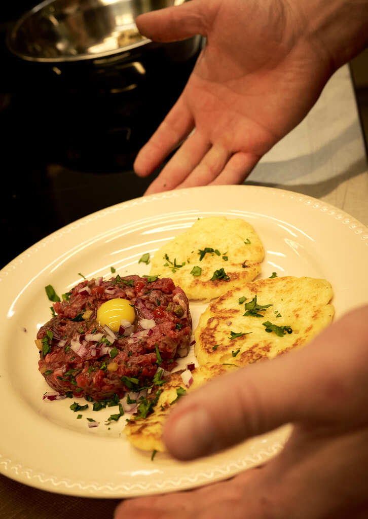 - Классический тар тар из говядины с чипсами из батата